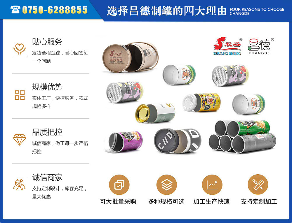 江門(mén)市昌德五金制罐有限公司位于江門(mén)與珠海臨近的古井鎮(zhèn),是專(zhuān)業(yè)生產(chǎn)紙罐,食品紙罐系列的包裝研制、開(kāi)發(fā)、生產(chǎn)的廠(chǎng)家,從建廠(chǎng)至今,公司本著“重合同、守信用”的原則,以“質(zhì)量求生存,客戶(hù)至上”為經(jīng)營(yíng)宗旨,贏(yíng)得了很好的信譽(yù),公司擁有國(guó)內(nèi)一流的技術(shù)設(shè)備和多年的生產(chǎn)經(jīng)驗(yàn)。年產(chǎn)休閑食品紙筒500萬(wàn)左右,紙筒2000萬(wàn)支左右,易拉罐,食品罐等1000萬(wàn)左右,產(chǎn)品銷(xiāo)往各地。我廠(chǎng)是以高科技為先導(dǎo),以技術(shù)創(chuàng)新整合為手段,成為迅速崛起的專(zhuān)業(yè)性包裝企業(yè),憑借艱苦的創(chuàng)業(yè)精神和集體智慧,采用規(guī)范的現(xiàn)代企業(yè)運(yùn)行機(jī)制,形成具有鮮明特色的企業(yè)文化模式和管理...